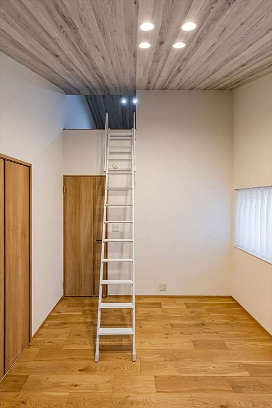 床や壁と異なる天井の柄もポイント。ロフト内も同じカラーコンセプトでまとめています。天井に採用したグレーの柄は、建物外観をはじめ家の随所に採用。一見、一般的な寝室に見えるものの、外観と統一されたグレーのワンポイントが一般的な寝室との大きな違いとなって映えます。