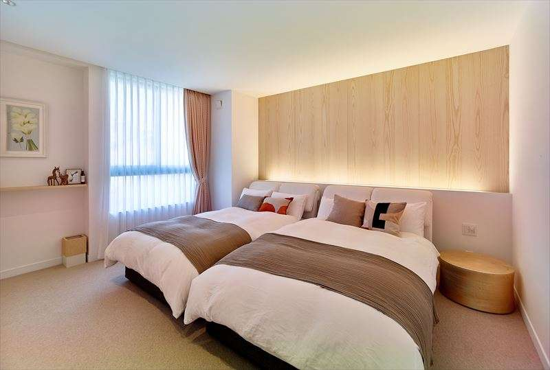 枕元に造り付けられたベッドボード、その背後から立つ間接照明、そしてホワイトアッシュの板張り。まるで高級ホテルのツインルームをイメージさせる贅沢なベッドルームです。